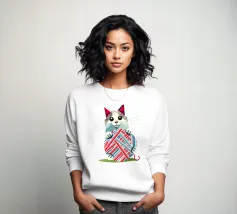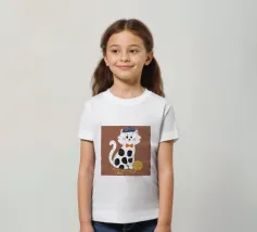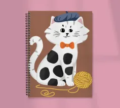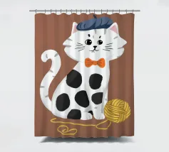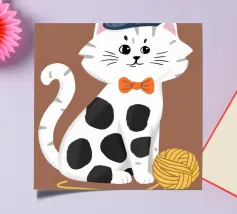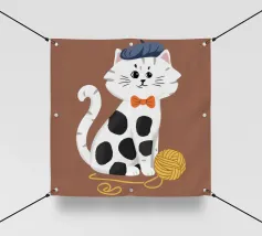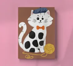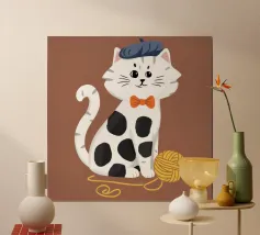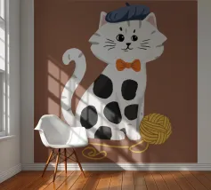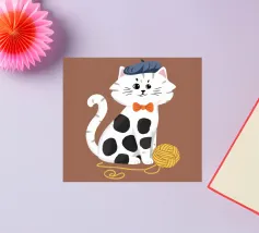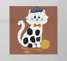 Un'affascinante illustrazione di un gatto bianco con macchie nere, che indossa un papillon rosso e una benda per gli occhi e interagisce giocosamente con un gomitolo di filo giallo. Lo sfondo è di un marrone tenue, che mette in risalto la personalità eccentrica e adorabile del gatto.