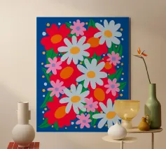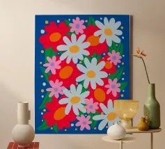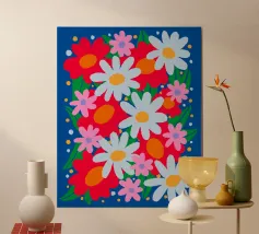 La vivace tavolozza di blu brillanti, toni caldi e verdi botanici rende questo pezzo una splendida celebrazione del massimalismo moderno. Perfetta per chi ama le decorazioni audaci e di impatto, quest'opera d'arte dona energia, fascino e bellezza ispirata alla natura a qualsiasi ambiente.