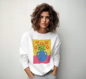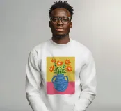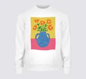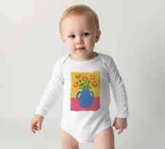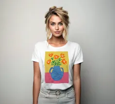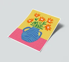 Un'illustrazione semplice e allegra di un bouquet di fiori arancioni in un vaso blu a righe ondulate su uno sfondo giallo sole. L'opera d'arte è luminosa e allegra, con un'affascinante sensazione di disegno a mano.