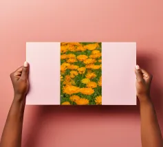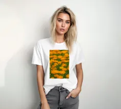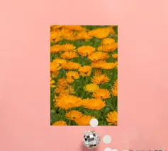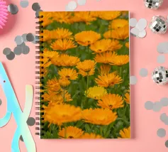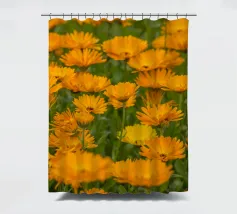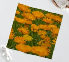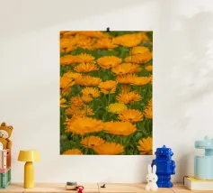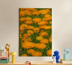 Immergetevi nel calore e nella vivacità della natura con questa fotografia mozzafiato di un campo di fiori di calendula. I petali dorati e arancioni si estendono sul campo, evocando un senso di pace e positività. Questa splendida immagine è un modo perfetto per portare la gioia della natura nella vostra casa, celebrando anche il significato più profondo del fiore di calendula.