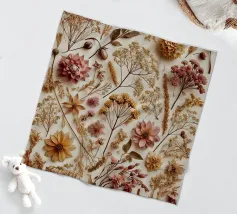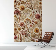 Una delicata composizione di fiori secchi nei tenui toni della terra, tra cui l'alito di bimbo color beige, la statice rosa tenue e la celosia arancione ruggine, su uno sfondo neutro bianco crema o grigio chiaro, con una texture sottile e un'ombreggiatura minima, che evoca un senso di semplicità, eleganza e nostalgia, con i fiori leggermente radi e sparsi, come se fossero delicatamente trasportati dal vento, riempiendo la cornice con un senso di bellezza ariosa e senza sforzo.