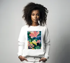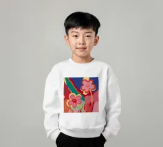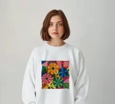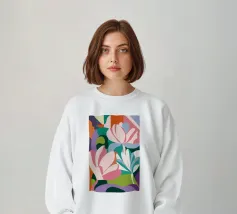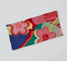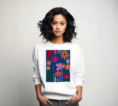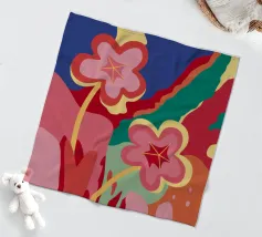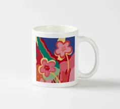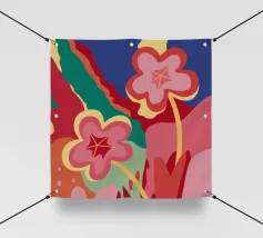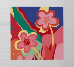 Fiori stilizzati rossi e rosa dalle forme semplici e decise si stagliano su uno sfondo ricco e scuro, creando un design floreale retrò e grafico con un tocco di nostalgia.