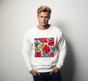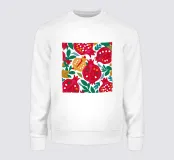 Un disegno vibrante e lussureggiante di melograni rossi maturi, alcuni aperti per rivelare i loro semi gioiello, intervallati da foglie verdi e fiori stilizzati. La composizione è una celebrazione ricca e fruttuosa dell'abbondanza della natura.