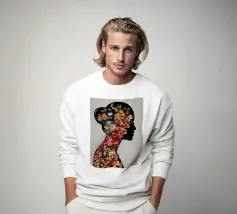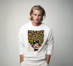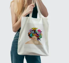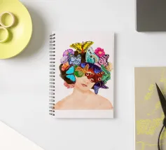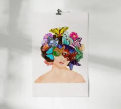 Collage disegnato e dipinto basato sulla propria fotografia. Ritratto di donna disegnato a mano e in digitale, con la testa ricoperta di farfalle e fiori. Un'esplosione di colori su uno sfondo tranquillo.