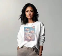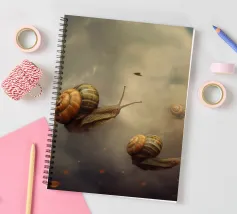 Una composizione surreale con lumache che scivolano senza sforzo in un cielo sognante pieno di nuvole soffici e braci incandescenti sparse. Questa scena stravagante fonde fantasia e natura, creando un'atmosfera unica e magica dal fascino delicato e ultraterreno.