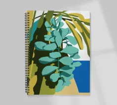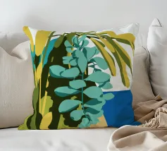 Illustrazione di una pianta sospesa con foglie arrotondate verde chiaro a cascata (stringa di monetine), su un semplice sfondo bianco e blu, che crea un'atmosfera serena e ariosa.