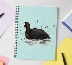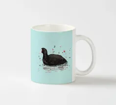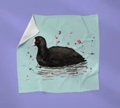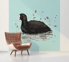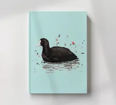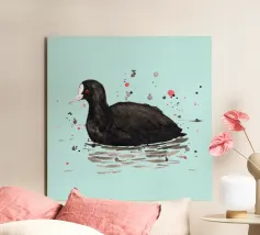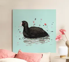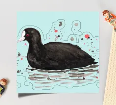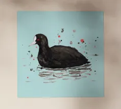 Disegno a china e inchiostro rosso di una folaga. Si vede l'uccello di lato e si vede un occhio rosso dell'uccello. Vi guarda con curiosità e gentilezza. Stile pittorico selvaggio.
