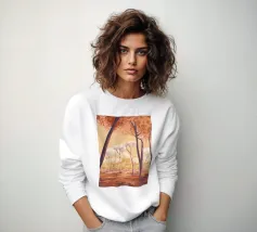 Una scena di foresta stilizzata con alberi alti e slanciati è immersa nella luce dorata dell'autunno, con una tavolozza calda di arancione, giallo e rosso che crea un'atmosfera tranquilla e bellissima.