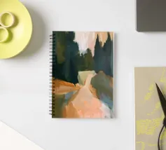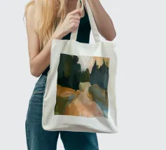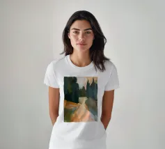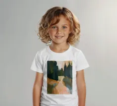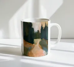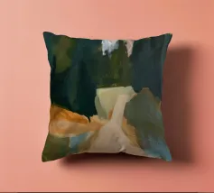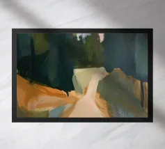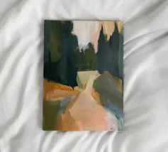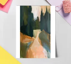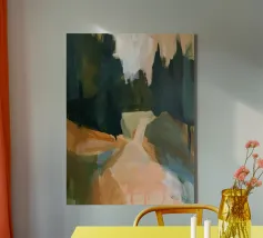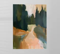 Paesaggio astratto dipinto con verdi profondi e calde tonalità della terra, che suggerisce un tranquillo sentiero nella foresta immerso in una luce soffusa.