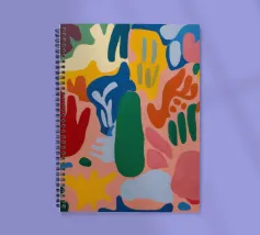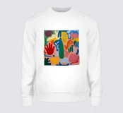 Un'allegra accozzaglia di forme astratte colorate in blu, giallo, rosso e beige sembra danzare sulla tela, creando una composizione vivace, energica e puramente astratta.