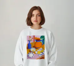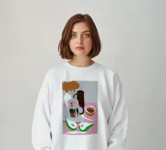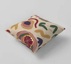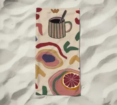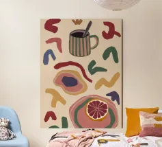 Una natura morta astratta con una tazzina di caffè, una fetta di agrume e varie forme organiche su uno sfondo a motivi, che suggerisce un momento di caffè moderno e artistico.