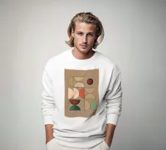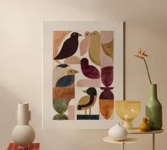 Uccelli stilizzati disposti in una tranquilla composizione geometrica. I colori caldi della terra e le forme semplici creano un equilibrio tranquillo e un ritmo gentile.