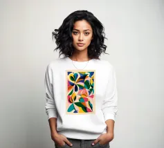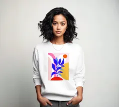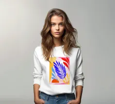 L'opera d'arte astratta presenta forme audaci e ritagliate di foglie e forme organiche nei colori blu, rosso e verde, chiaramente ispirate all'opera iconica di Henri Maraoui.