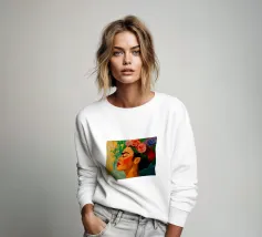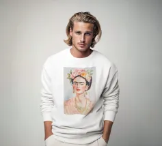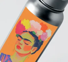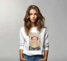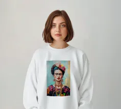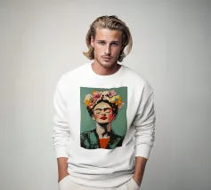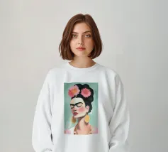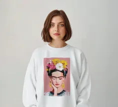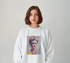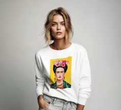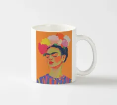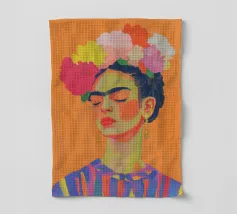 Frida Kahlo risplende in brillanti colori al neon con una corona di fiori e labbra rosse in questo autoritratto ispirato alla pop art che cattura la sua personalità unica e il suo potere creativo.