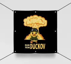 Un coraggioso papero in equipaggiamento tattico cammina con sicurezza verso un'enorme esplosione.