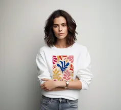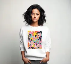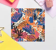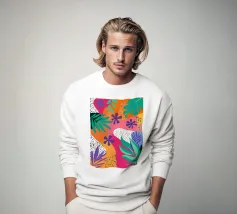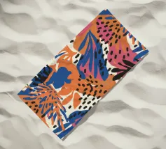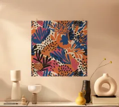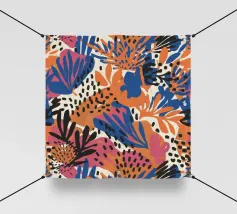 Un motivo audace ed energico che combina la stampa leopardata con fiori e foglie tropicali astratti in una vivace combinazione di colori, creando una fusione selvaggia e alla moda.