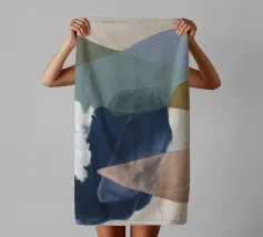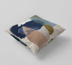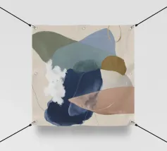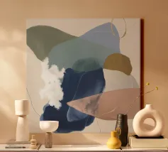 Un dipinto astratto con forme organiche morbide e sovrapposte in toni tenui di verde oliva, blu polveroso e beige, con un accento scuro di fondo, che crea un'atmosfera calma e terrena.