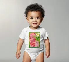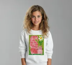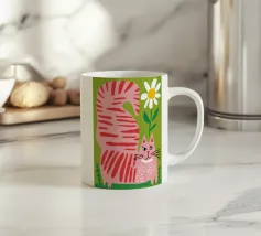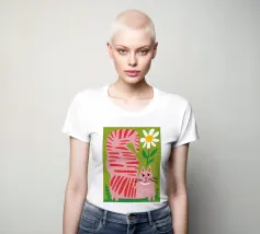 Un'illustrazione stravagante di un gatto a strisce rosa con un'espressione felice, su uno sfondo di grandi foglie verdi e una margherita bianca.