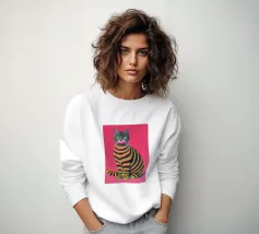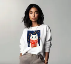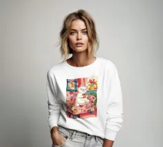 Un affascinante gatto bianco con gli occhi azzurri indossa un maglione a righe colorate in un arcobaleno di colori: rosso, arancione, giallo, verde e blu. È seduto accanto a una tazza da tè gialla, su uno sfondo rosa.