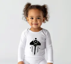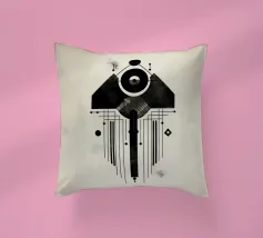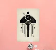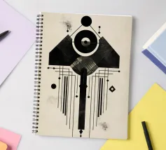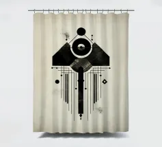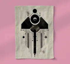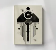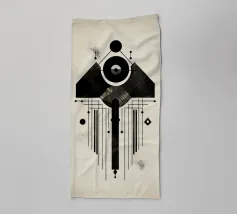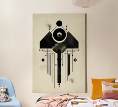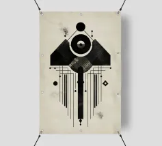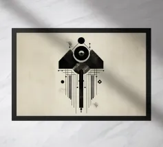 Un sorprendente disegno geometrico astratto in bianco e nero caratterizzato da linee simmetriche, cerchi e angoli acuti. L'intricata composizione fonde modernismo ed estetica futuristica, evocando un senso di mistero e precisione in un elegante stile minimalista.
