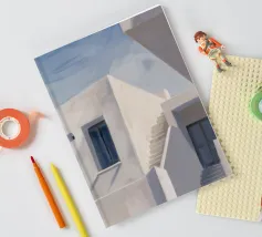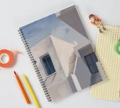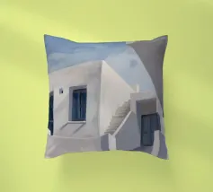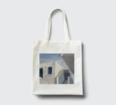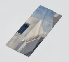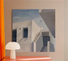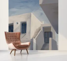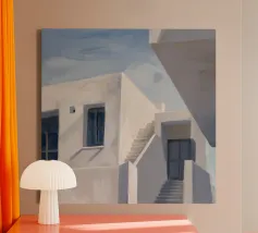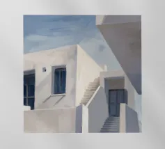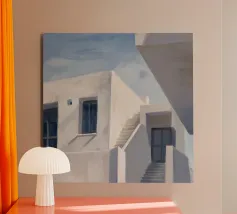 Le pareti bianche di un edificio, probabilmente in un contesto mediterraneo o greco, sono scolpite da ombre blu profondo sotto un cielo luminoso. La composizione è un bellissimo studio minimalista di luci, ombre e forme geometriche.