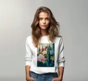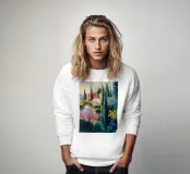 Una vivace scena di giardino è animata da colori, con alti cipressi, arbusti rosa in fiore e fiori blu, tutti dipinti in uno stile fauvista altamente espressivo che irradia energia e gioia.