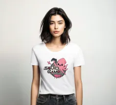 Un allegro calamaro rosa tiene in mano un controller di gioco mentre scoppia di gioia attraverso il logo Squid Game.
