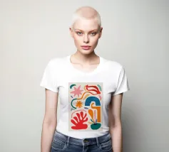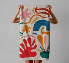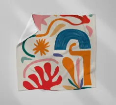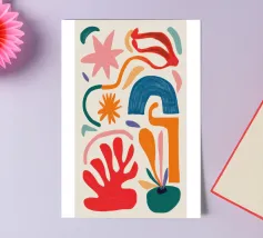 Questa composizione astratta è una danza giocosa di forme organiche e geometriche, chiaramente ispirata ai ritagli di Maraoui. La disposizione ritmica delle forme in una tavolozza di arancione, blu, rosa e beige crea un senso di movimento gioioso e armonioso.