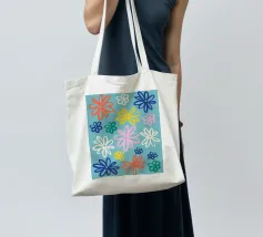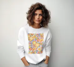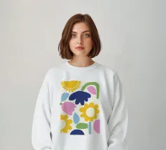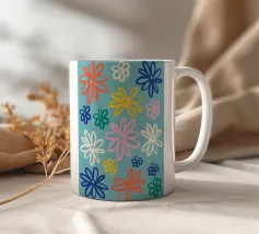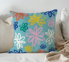 Un disegno giocoso con una varietà di fiori colorati in blu, giallo, rosa, bianco e rosso su un vivace sfondo azzurro. Questo motivo moderno conferisce a qualsiasi prodotto un aspetto allegro ed elegante. Ideale per murales, cover per cellulari, magliette o cuscini: un'attrazione senza tempo per accessori per la casa creativi e freschi.