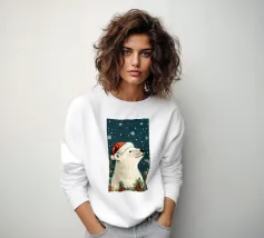 Un orso polare bianco che viaggia in una vorticosa sfera di neve floreale circondata da fiori rosa, stelle scintillanti e rami botanici blu. Ispirato alla vita degli orsi polari canadesi vicino alla tundra aperta e all'aria artica della Baia di Hudson.