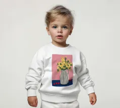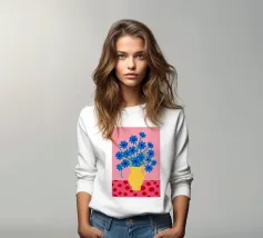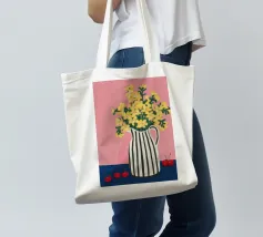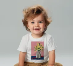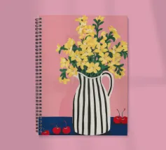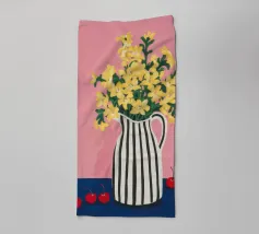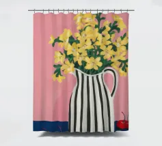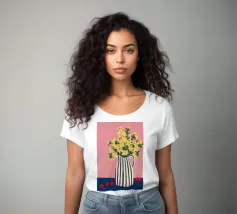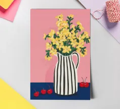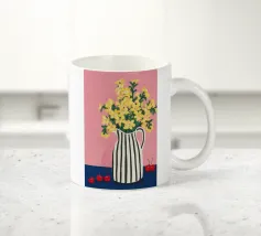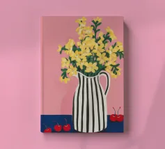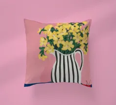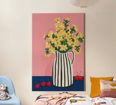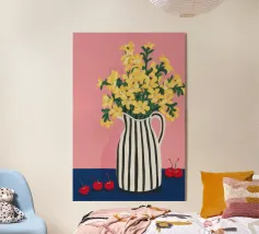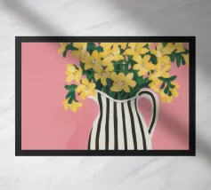 Una natura morta moderna e grafica di un bouquet di fiori gialli brillanti in un vaso a righe bianche e nere di grande effetto. Lo sfondo rosa tenue crea un delicato contrasto con i motivi e i colori audaci.