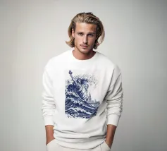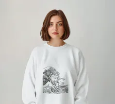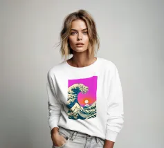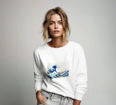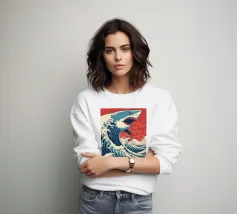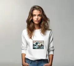 L'immagine raffigura un'illustrazione stilizzata in bianco e nero della Grande Onda al largo di Kanagawa, una famosa xilografia giapponese, con la Torre Eiffel sovrapposta all'onda. L'onda è raffigurata in un movimento dinamico e vorticoso, con creste spumeggianti e una base blu intenso. La Torre Eiffel si erge alta e slanciata, con la sua struttura intricata che contrasta con la forma organica dell'onda.