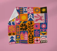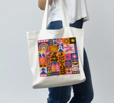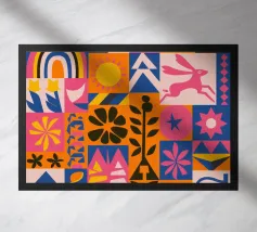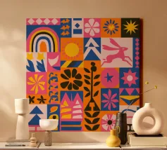 Una griglia vivace e cromatica è riempita da una varietà di motivi colorati e icone ispirate all'arte popolare, creando una composizione ricca, decorativa e gioiosa.
