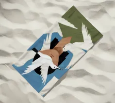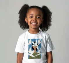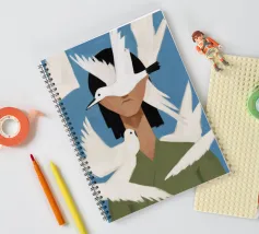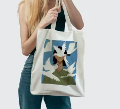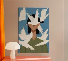 Ritratto di una persona dall'espressione serena, con due colombe o uccelli bianchi che ne incorniciano il volto. La composizione è simbolica e pacifica, con una tavolozza di colori freddi, verdi e bianchi, che evocano un senso di armonia e protezione.