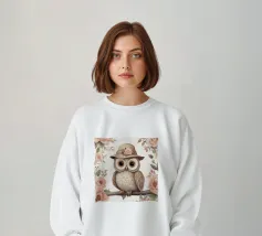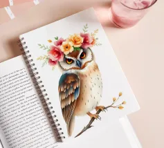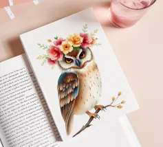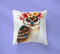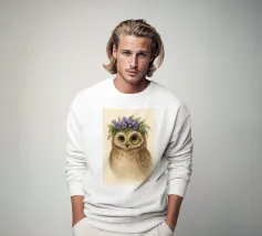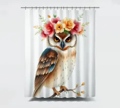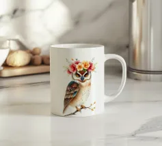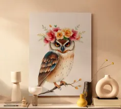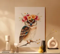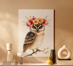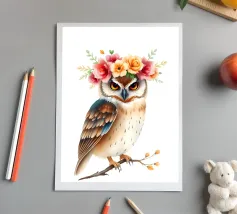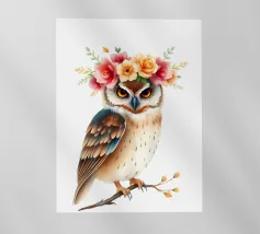 Ritratto di gufo con corona floreale appollaiato su un ramo.