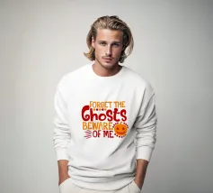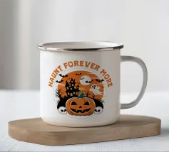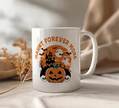 L'immagine a tema Halloween raffigura una casa infestata, una zucca intagliata, fantasmi e pipistrelli sotto la luna piena. La frase "Haunt Forever More" è riportata in alto e sottolinea l'atmosfera spettrale.