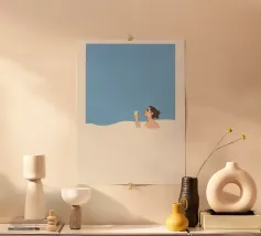 Abbandonatevi al lusso sereno di questo elegante disegno con una donna che si rilassa in acque tranquille, con un bicchiere di vino in mano. L'opera d'arte irradia calma, raffinatezza e un tocco di indulgenza, fondendo bellezza e relax in un'unica composizione di grande effetto. Perfetto per gli amanti dell'arte che celebra la cura di sé, la femminilità e una vita di piaceri raffinati.