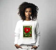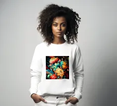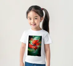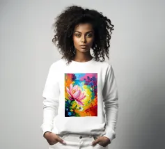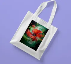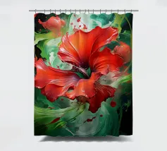 Un'opera d'arte digitale straordinaria presenta un fiore di ibisco rosso vivo circondato da spruzzi dinamici di vernice verde e gialla. Il movimento vorticoso e le texture fluide creano una composizione artistica ed energica che unisce la natura all'espressionismo astratto.