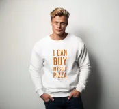 Un'affermazione minimalista di grande impatto: la scritta a blocchi verticali "I CAN BUY MYSELF PIZZA", in arancione acceso su sfondo bianco, sembra un manifesto di autodeterminazione - umoristico, diretto e assolutamente condivisibile. Sotto, delicata ed elegante, la firma "studio scusi" conferisce al tutto un affascinante tocco mittente.