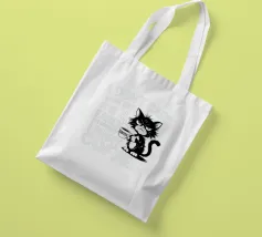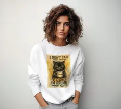 Un gatto brontolone che tiene in mano una tazza di caffè fumante è accompagnato da un testo umoristico che sottolinea il desiderio di caffè a prescindere dall'ora e dal giorno.