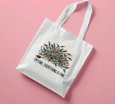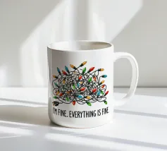 Un groviglio di luci natalizie colorate è accompagnato dal testo "I'm fine. Tutto va bene" su uno sfondo semplice. La frase contrasta in modo umoristico con il caos delle luci.