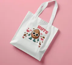 Un simpatico personaggio antropomorfo con occhi grandi e stivali è circondato da cuori e piccole noci galleggianti. L'illustrazione è accompagnata da un testo giocoso che recita "Sono pazzo di te".