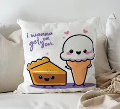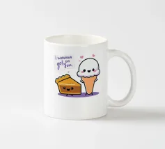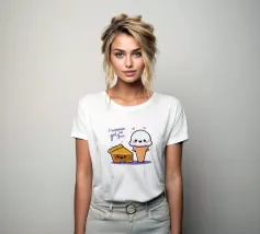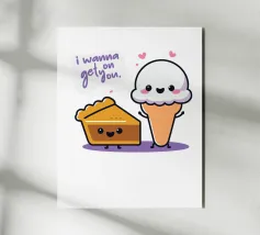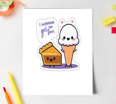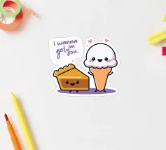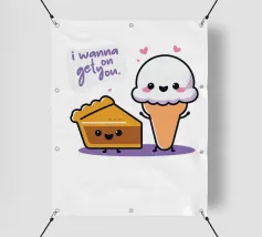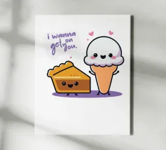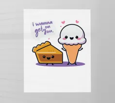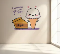Un simpatico cartone animato raffigura un cono gelato e una fetta di torta con facce sorridenti, che esprimono un messaggio giocoso. La fetta di torta dice: "Voglio salire su di te", circondata da piccoli cuori rosa.