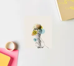 Un'illustrazione giocosa ed elegante della mano di una donna che tiene un classico cono gelato, disegnata con linee espressive e sottolineata da accenti di colore audaci ed estivi. Questa opera d'arte moderna e nostalgica cattura la dolcezza spensierata dell'estate con un tocco di fascino vintage. Perfetto per l'arredamento di cucine, caffè, negozi estivi o per chiunque ami il gelato e l'arte stravagante con un tocco retrò.