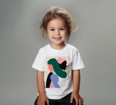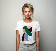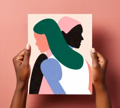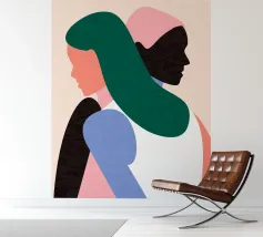 Un'opera d'arte astratta moderna che presenta due sagome sovrapposte, simbolo di unità e dualità. La composizione audace ma minimale fonde colori tenui e ricchi, creando un'armonia visiva. Questo pezzo evoca i temi della connessione, dell'identità e della coesistenza in uno stile contemporaneo.