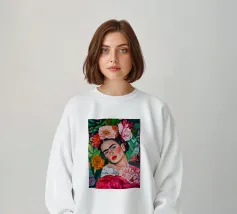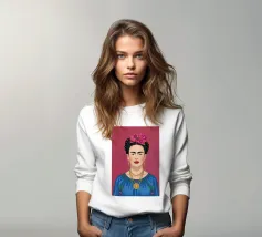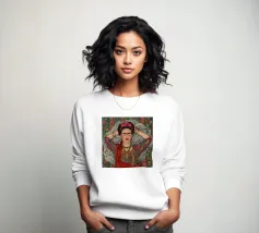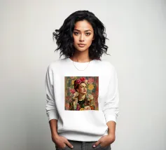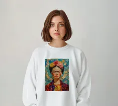 Questo vibrante ritratto di Frida Kahlo la ritrae in costume tradizionale messicano con una colorata corona di fiori che incarna il suo legame con il folklore e il simbolismo femminista.