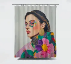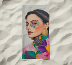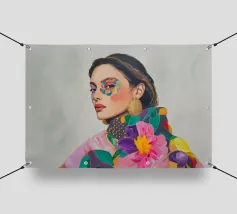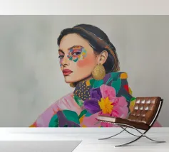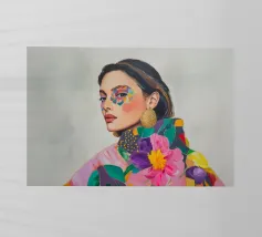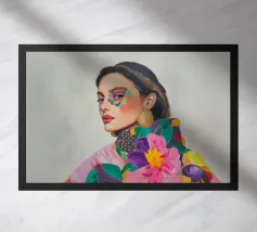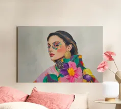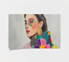Un elegante ritratto di donna con orecchini d'oro in campi di colori vivaci e motivi astratti celebra la femminilità in stile boho. Quest'arte contemporanea combina in modo armonioso moda, make-up ed eleganza.