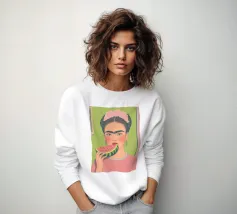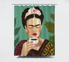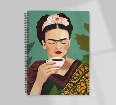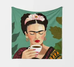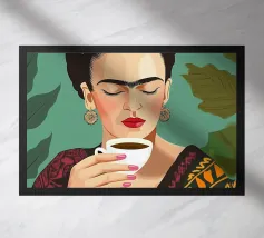 Frida Kahlo, adornata da una corona di fiori colorati, gusta il suo caffè da un'elegante tazza di porcellana, circondata dalla rigogliosa botanica della sua cultura messicana. Questa illustrazione incarna l'eleganza creativa e la gioia di vivere in ogni pennellata.