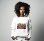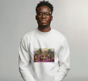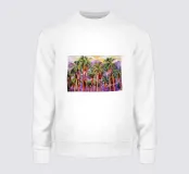 Un boschetto di palme è raffigurato in uno stile astratto e prismatico, con strisce verticali di colori vivaci e illuminati, viola, rosa e gialli, che creano una scena tropicale moderna ed energica.