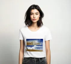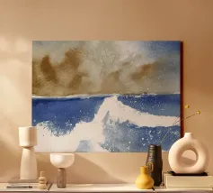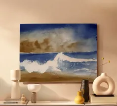 Un luminoso acquerello marino che raffigura un'onda che si infrange sotto un cielo spazzato dalla tempesta. I toni terrosi della sabbia si fondono con l'oltremare profondo e i bianchi spumeggianti, catturando l'energia grezza e la calma poetica dei momenti costieri. Ideale per interni naturali, sereni o ispirati alla costa.